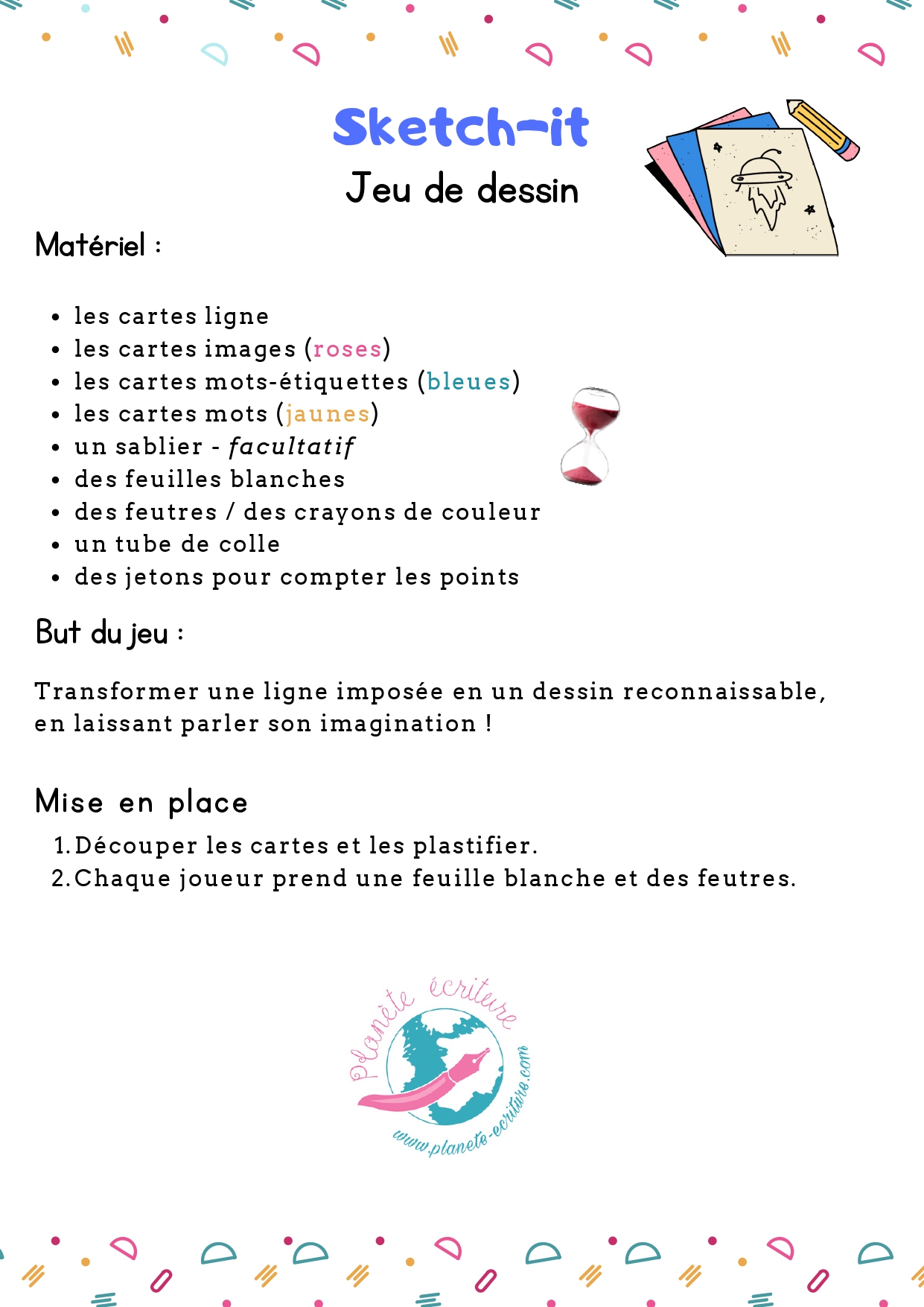 Les joueurs transforment une ligne imposée en un dessin reconnaissable grâce aux cartes mots et aux cartes images.