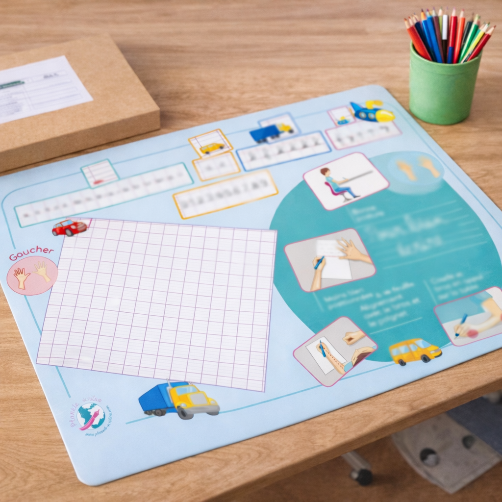Le sous-main gaucher est le matériel indispensable à l’école, à la maison et au cabinet. Il reprend toutes les étapes de la recette pour bien écrire : 5 doigts bien positionnés, 26 lettres minuscules bien formées, une feuille bien placée, un stylo adapté!